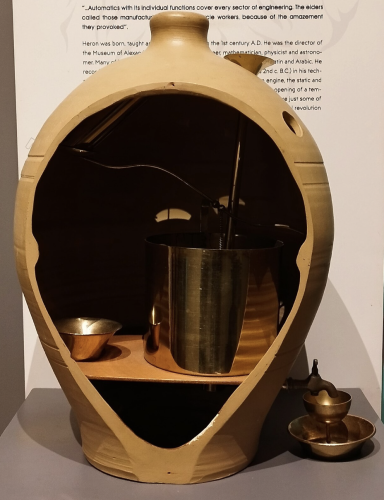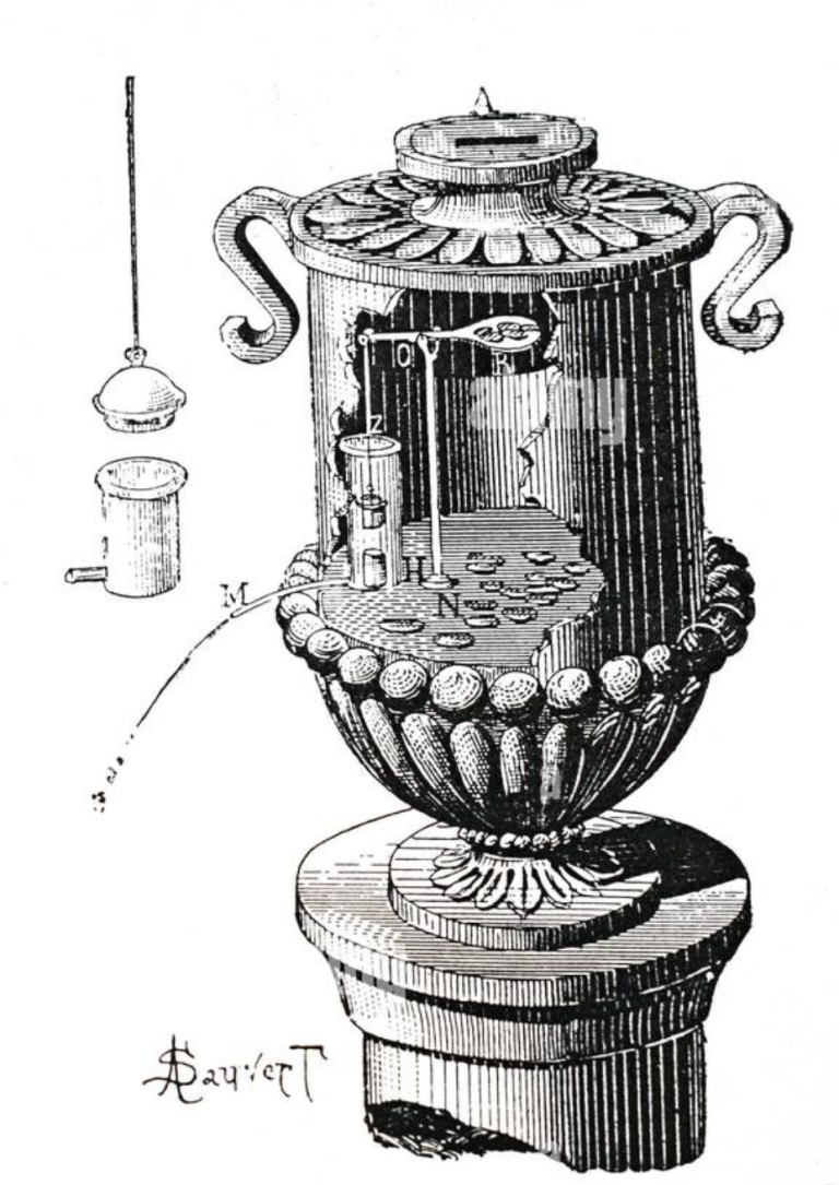 This device was not just theoretical—Hero described its construction in his work Pneumatica, showing that such machines were actually built and used. Long before today’s snack and drink dispensers, the basic principle of automated exchange had already been established, not for profit, but to ensure fairness in sacred rituals.