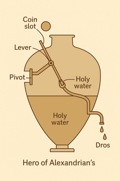 To address this, Hero created what is regarded as the earliest example of a vending machine. The design was clever yet straightforward: when a coin was dropped into a slot, it landed on a small tray connected to a lever. The weight of the coin pushed the lever down, opening a valve that released a measured amount of holy water. As the coin eventually slid off, the lever sprang back into place, shutting the valve and stopping the flow.
